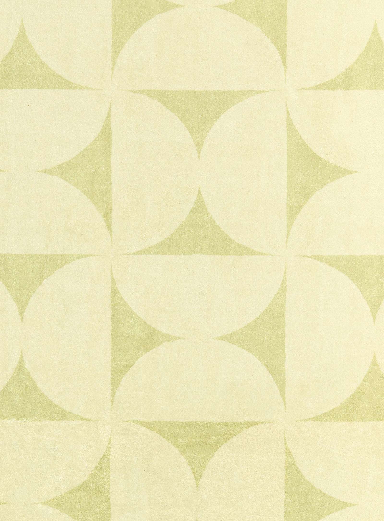 A cream retro semi-circle hourglass pattern on an muted green background. A uniquely modern and contemporary geometric rug design to accent any space and decor.