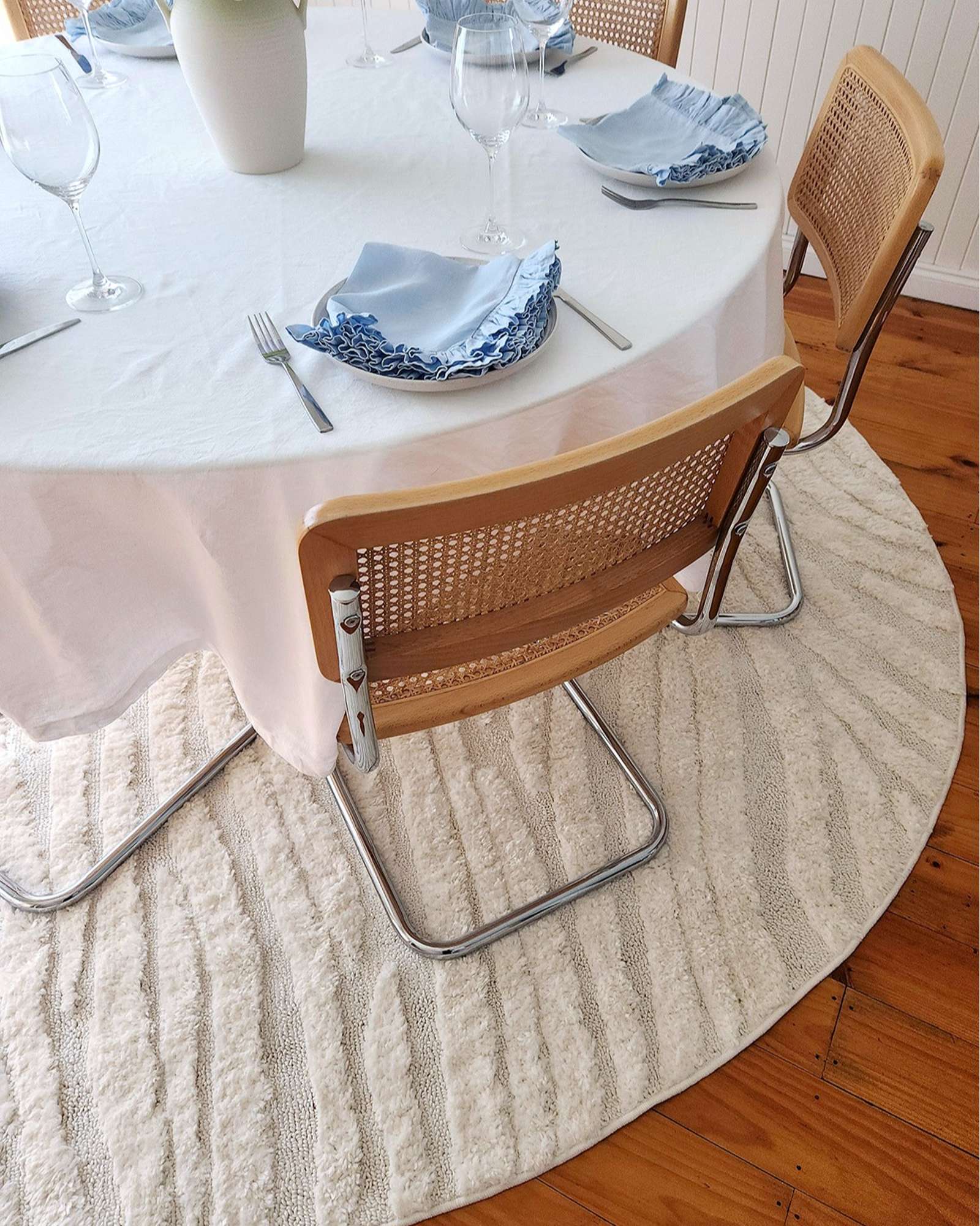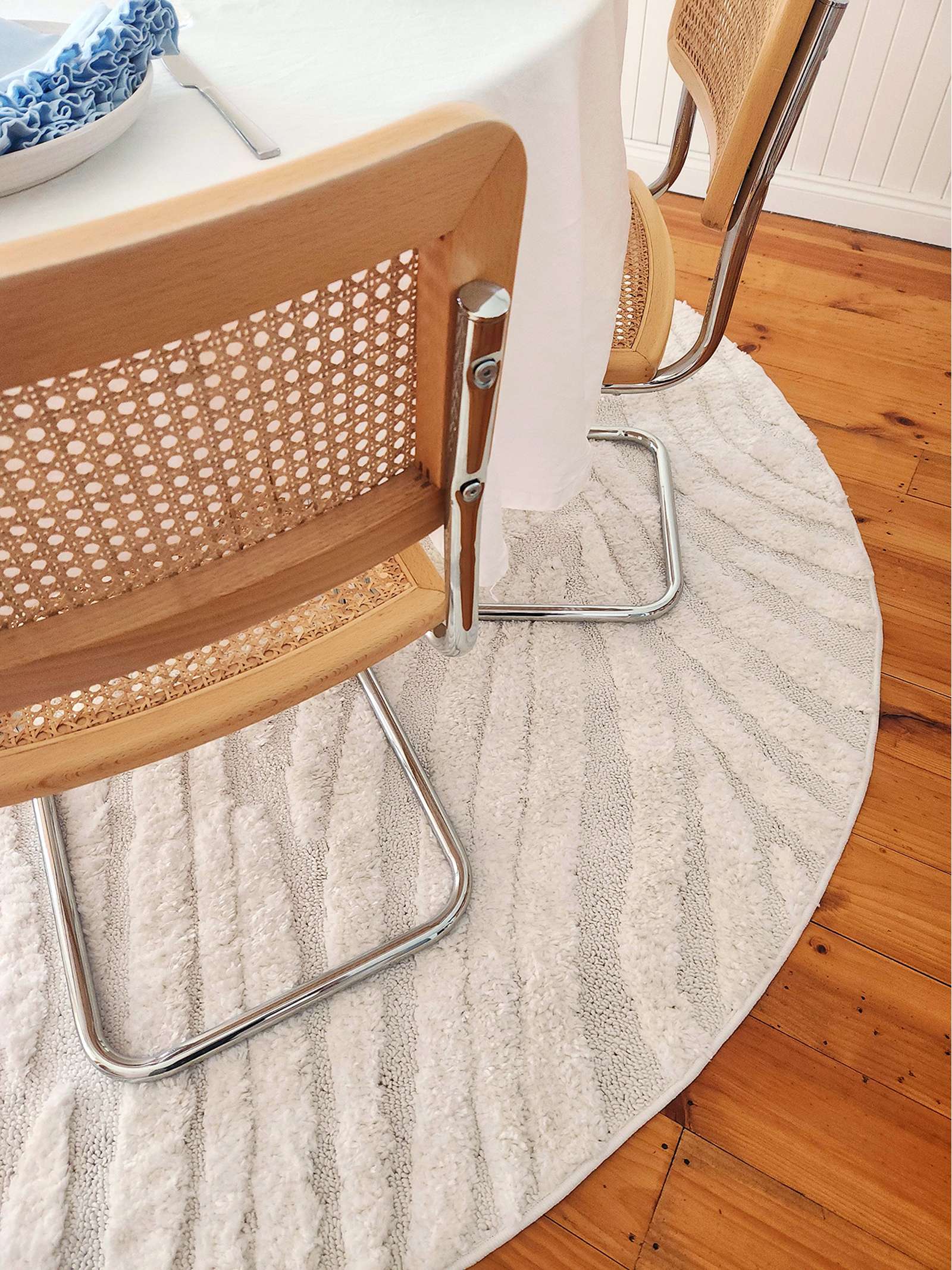 Sisco is a warm-based ivory and cream round rug featuring an abstract wave line pattern created with a high low pile variation.A unique texture that adds an extra-dimensional look.