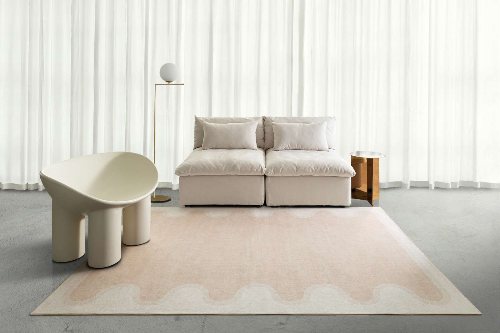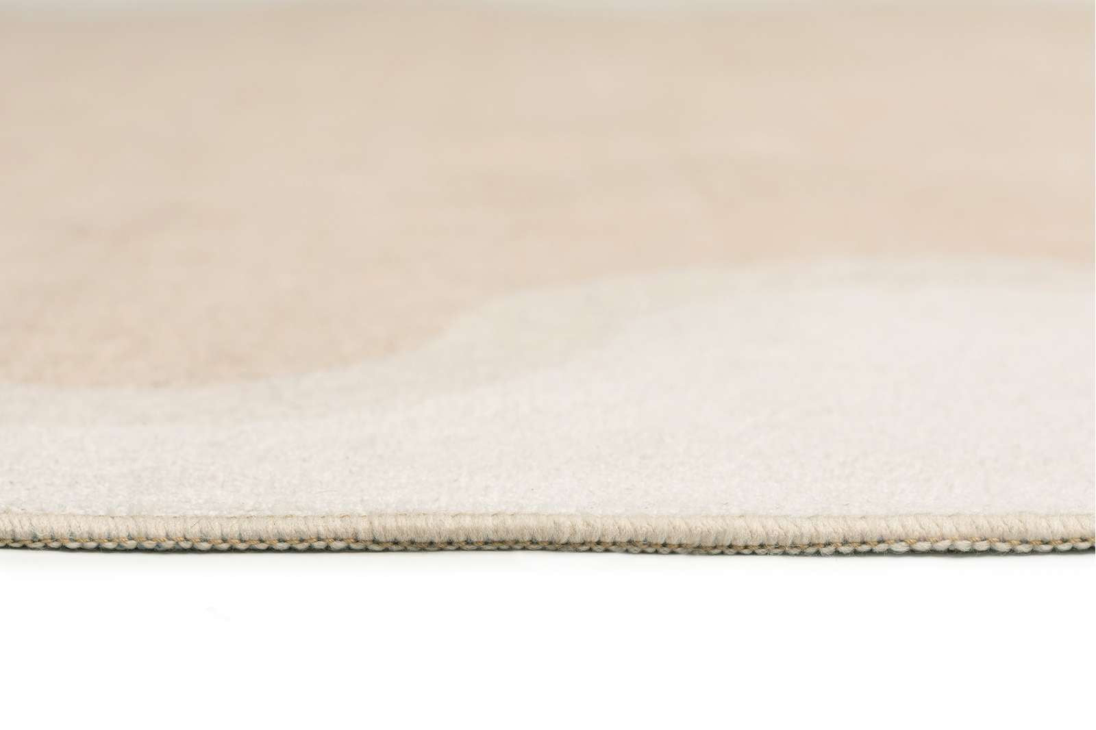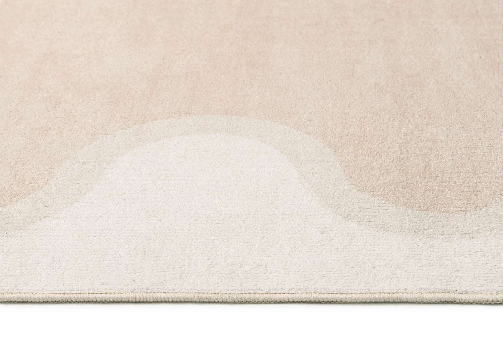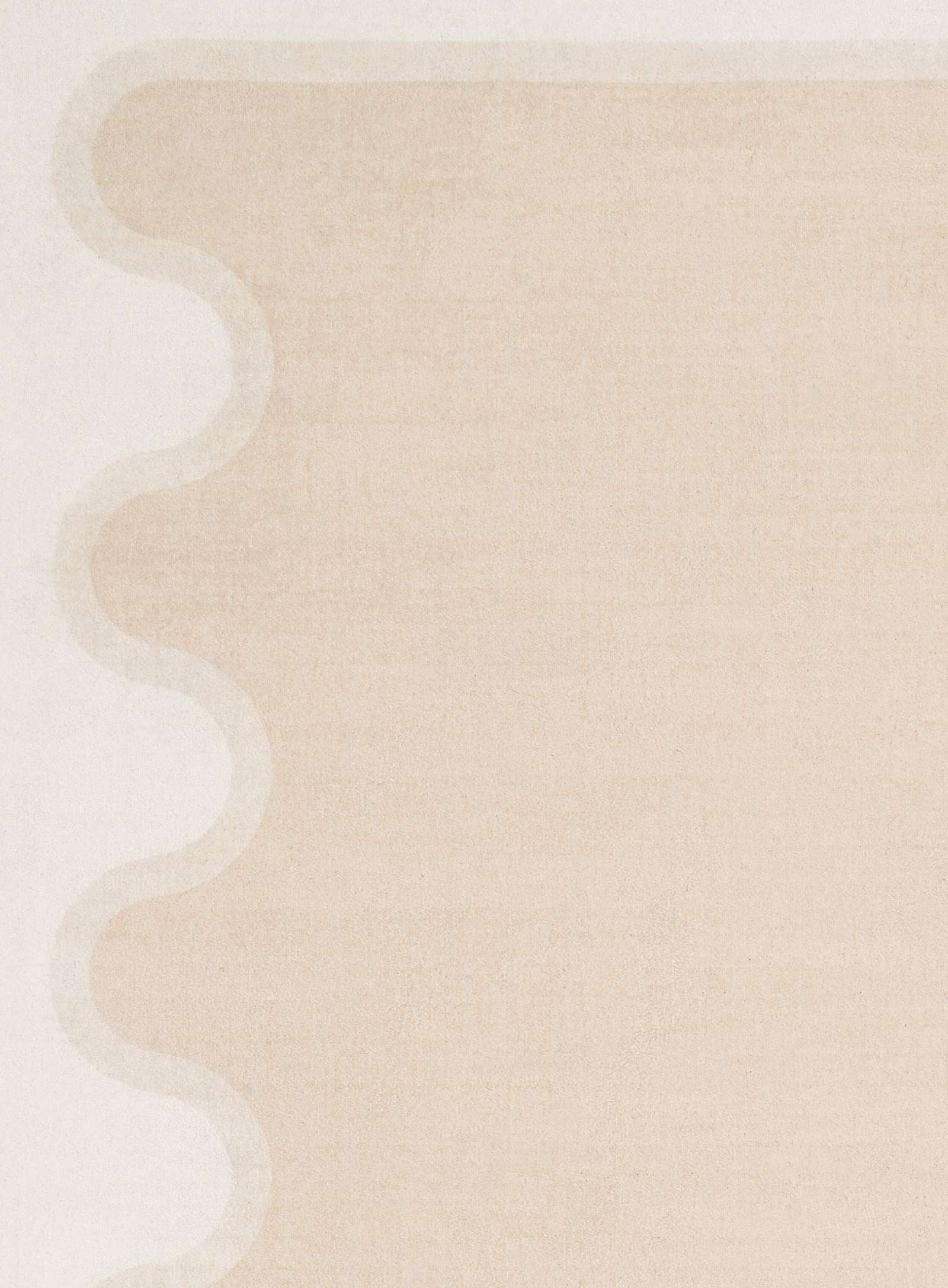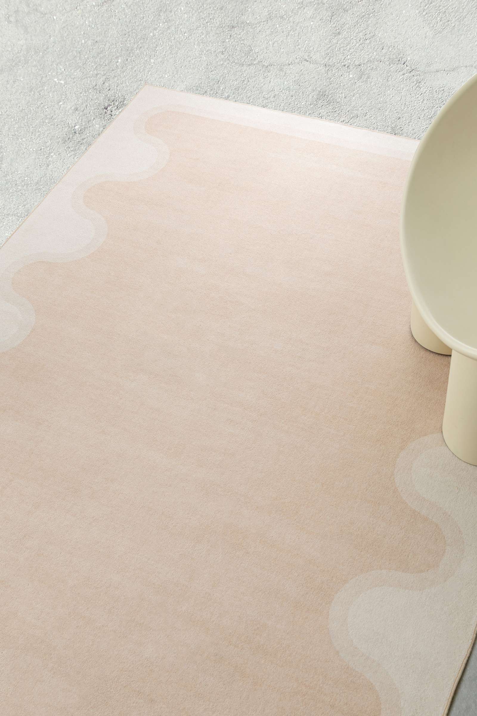Hanauma is a beige and cream smooth machine washable and foldable flatweave rug, with a modern curved border design. A versatile and timeless addition to any space.