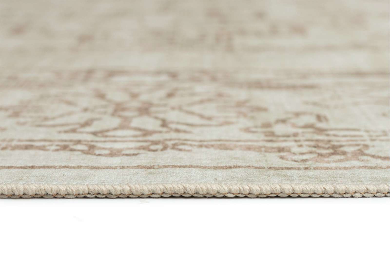 Castile is a smooth machine washable foldable flatweave rug with a detailed floral and vine pattern in soft taupe on an ivory background, inspired by timeless Persian-style designs.