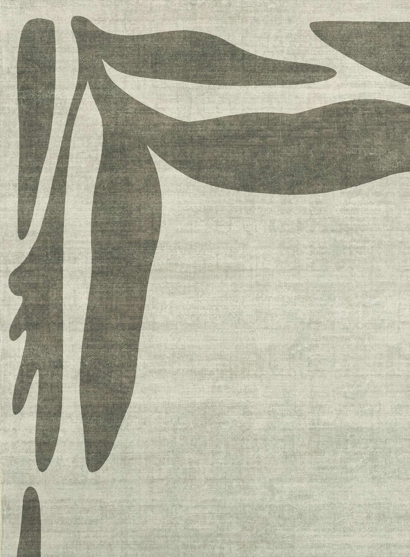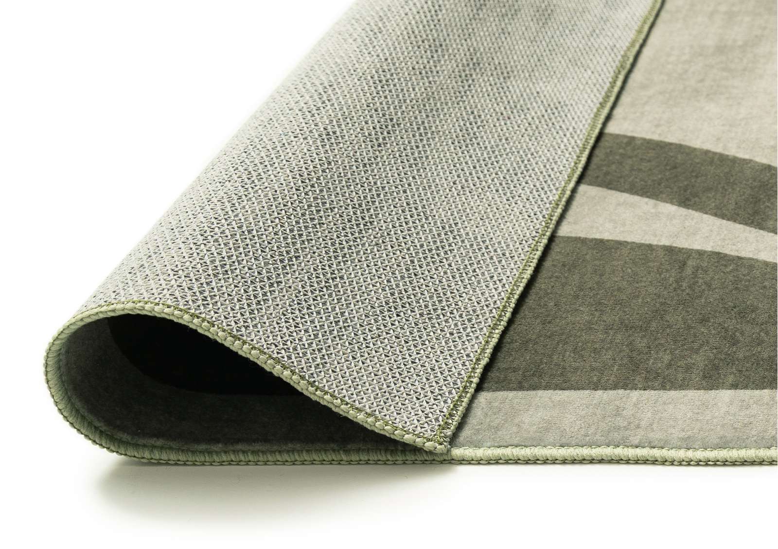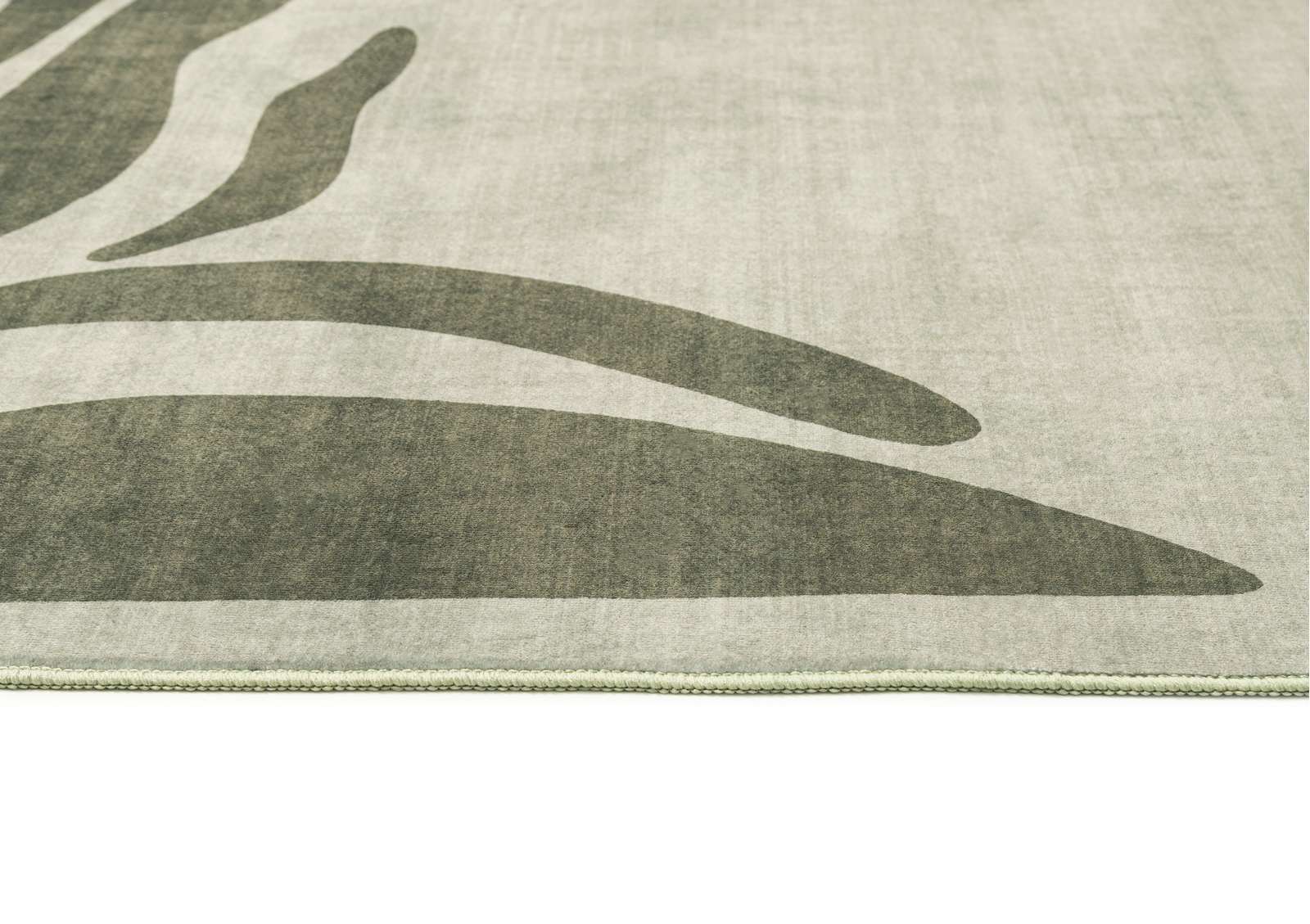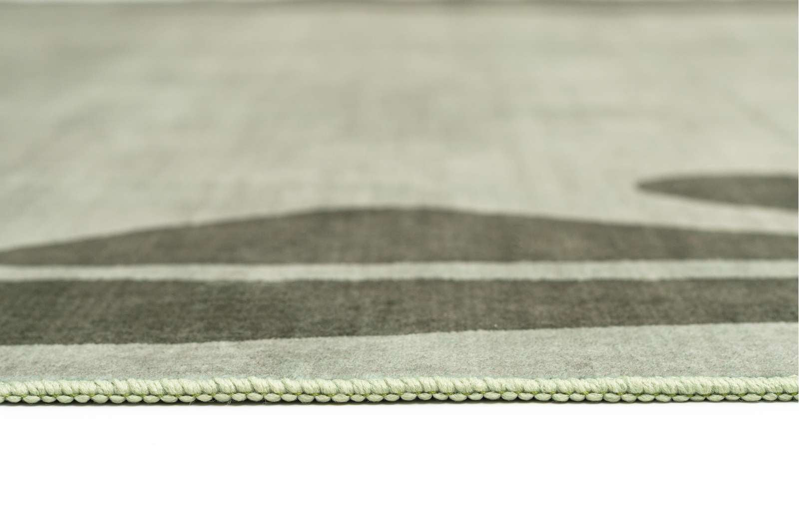 Kanarsi is a smooth machine washable foldable flatweave rug in a tonal green palette featuring botanical illustrations lining the border.