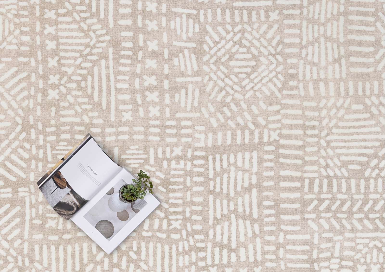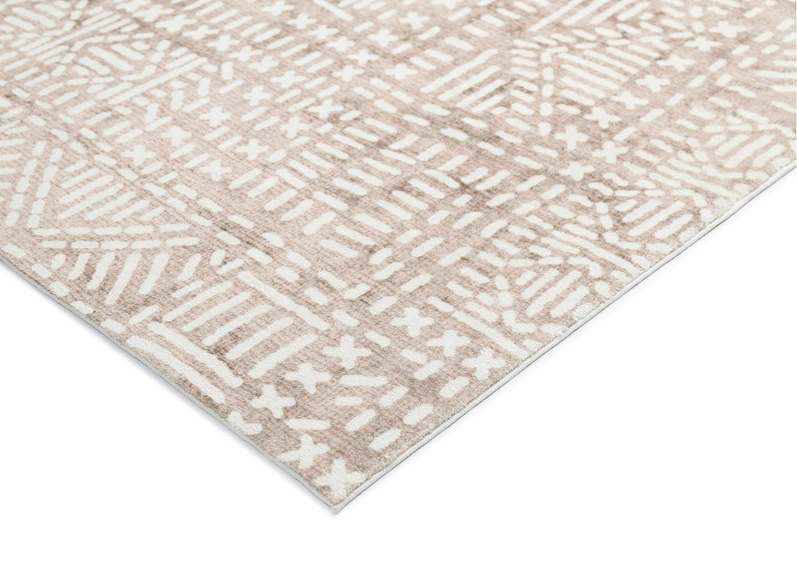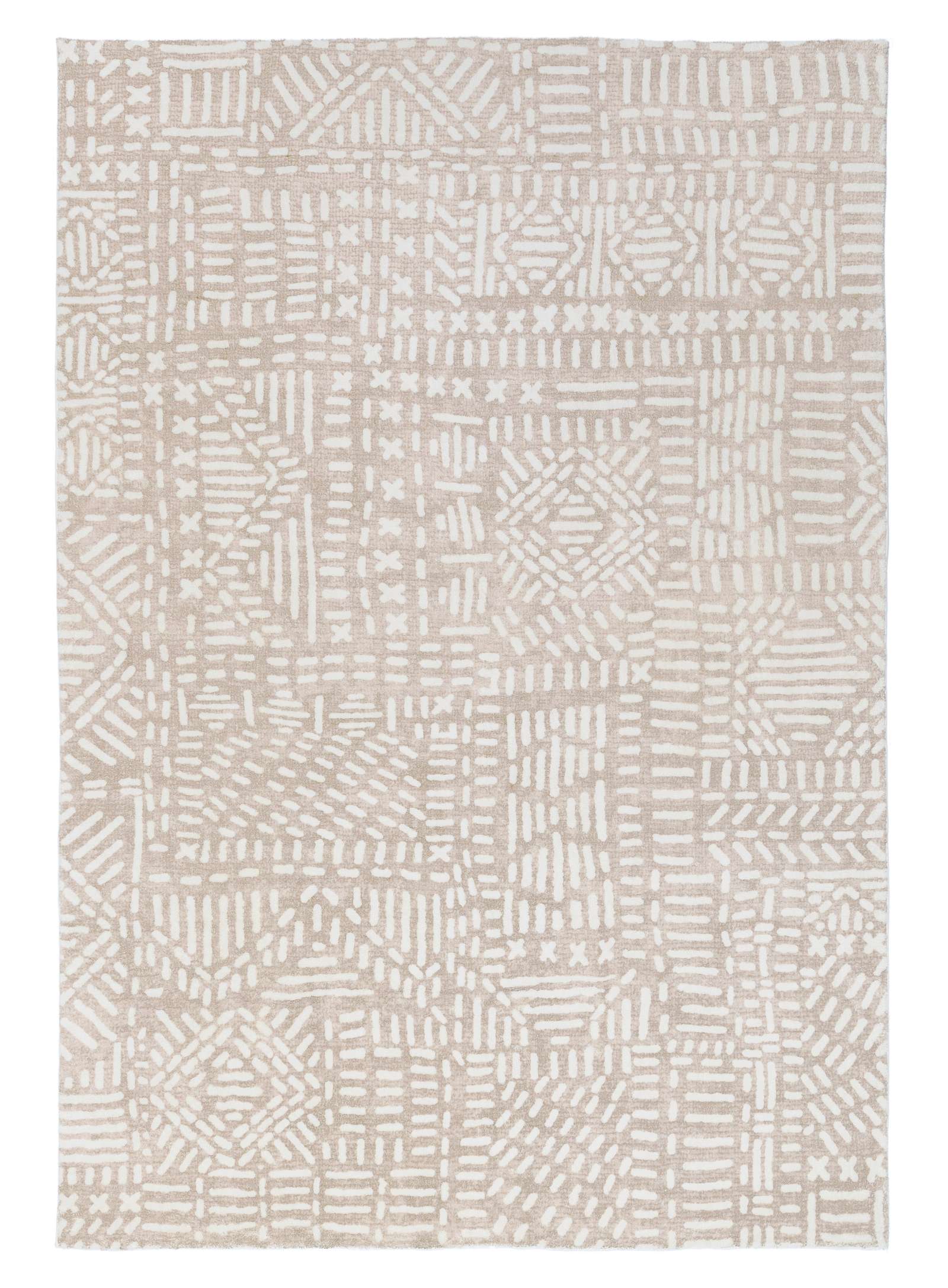 An ivory tribal line pattern on a multi-toned brown beige-based background for a textured dimensional look. A uniquely modern and contemporary rug design to accent any space and decor.