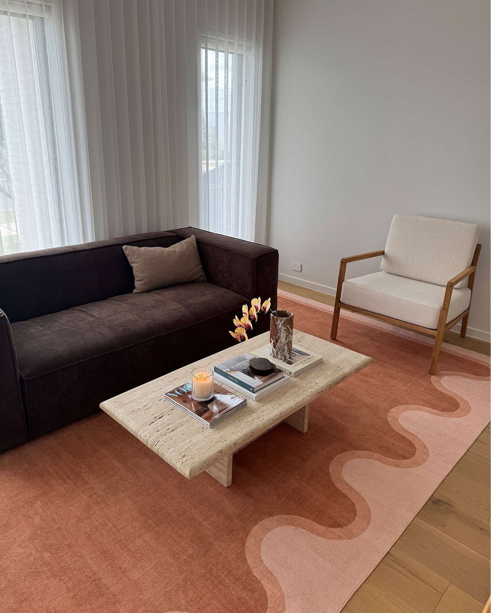 Lanai is a smooth machine washable and foldable flatweave rug in a warm brown terracotta tone with a modern curved border design. A versatile and timeless addition to any space.
